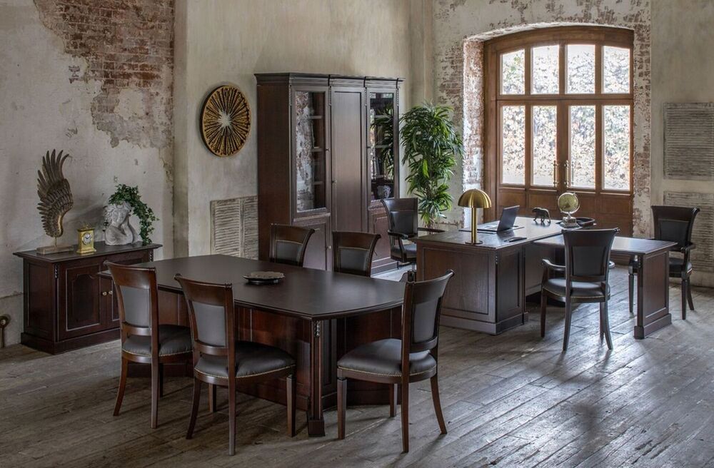 Классический стиль подчёркивает солидность и стабильность компании. Характеризуется использованием дорогих натуральных материалов, таких как дерево и кожа. Декор может включать резные элементы и изысканные детали. Подходит для компаний, которые хотят создать атмосферу доверия и уверенности.
