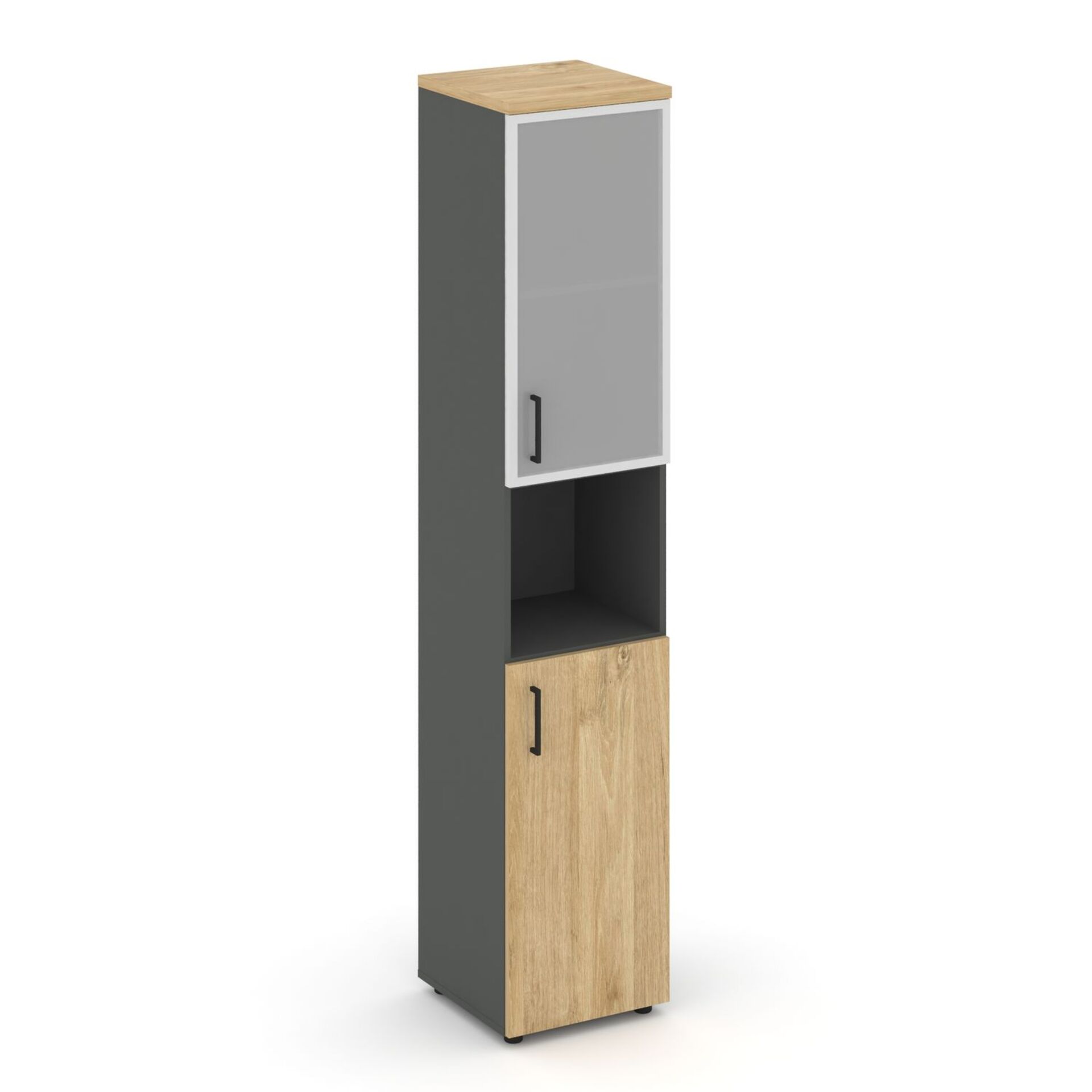 Шкаф высокий узкий правый (1 низкий фасад ЛДСП + 1 низкий фасад стекло сатин в раме) SN.STU-106(R)